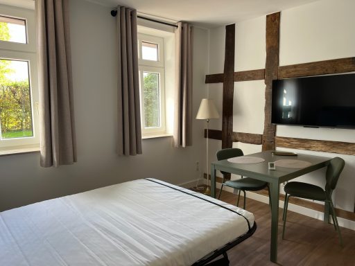 Wohnen: Einzelbett | Kleiderschrank | Smart-TV | ausziehbarer Esstisch | Gartenblick