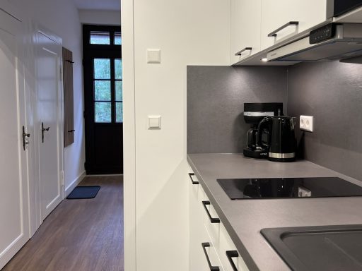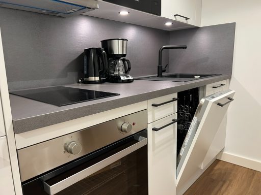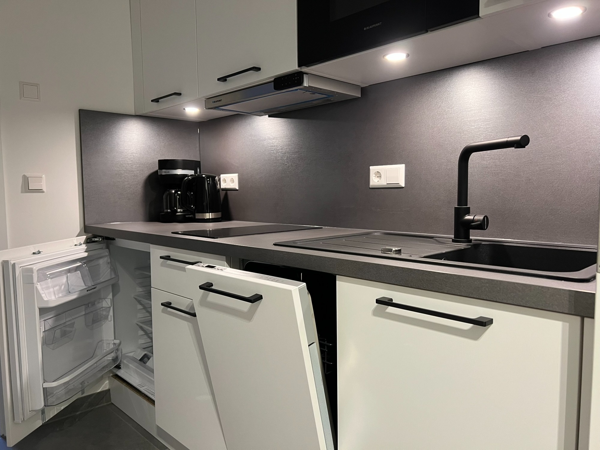 Küche: Kühlschrank | Ceranfeld | Mikrowelle | Dunstabzugshaube | Geschirrspüler | Spülbecken | Kaffeemaschine | Wasserkocher | alle notwendigen Küchenutensilien