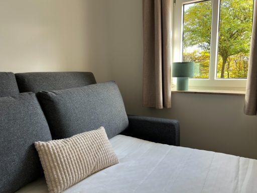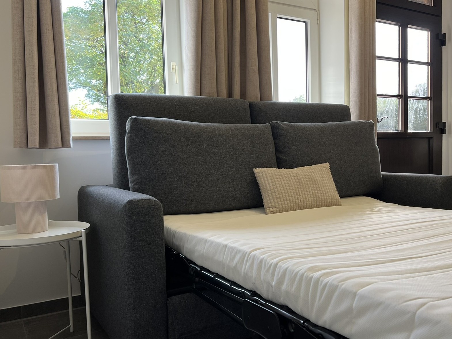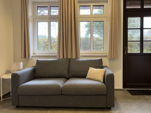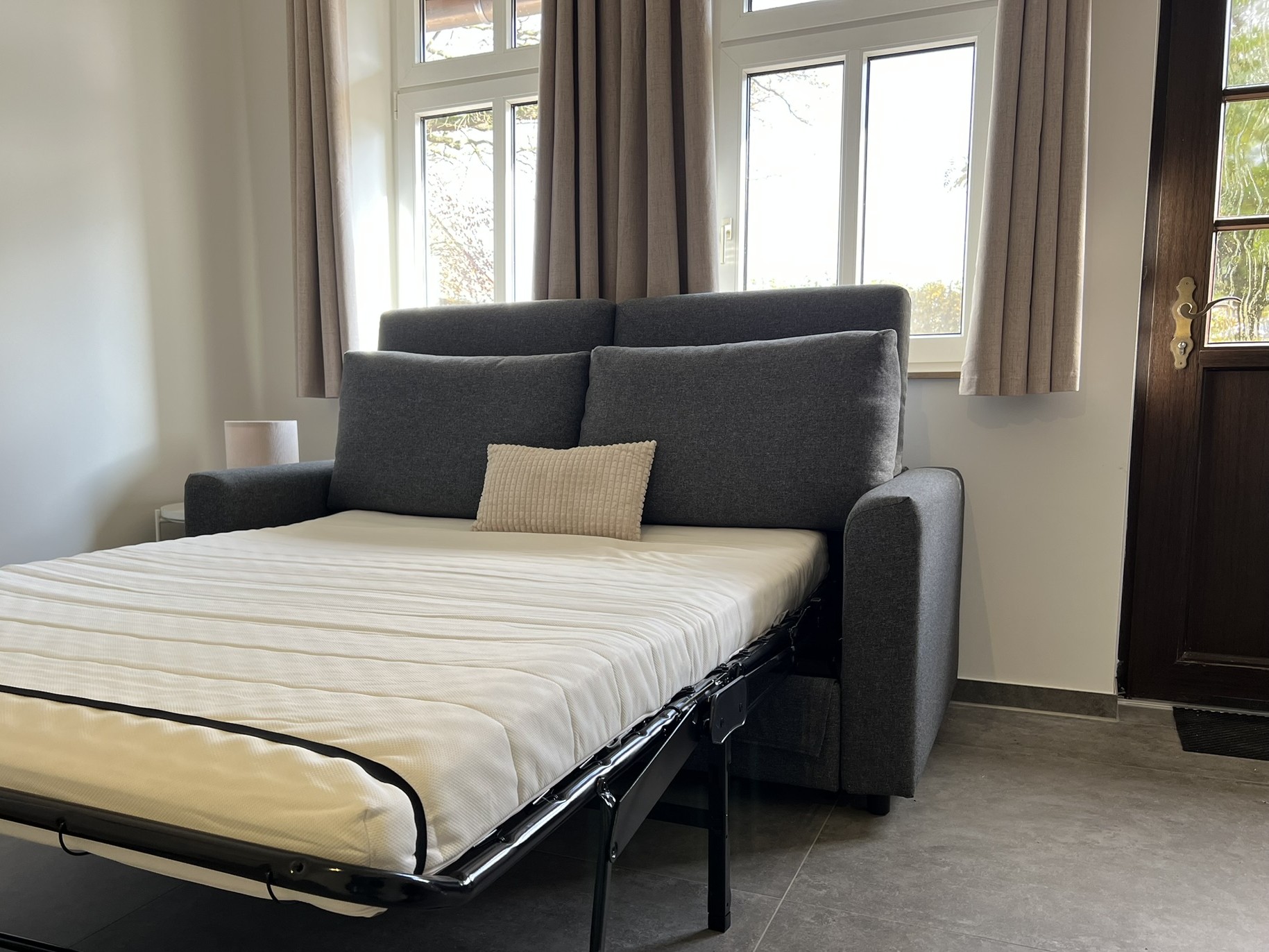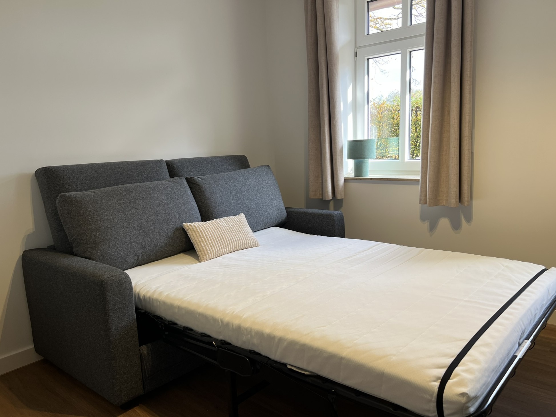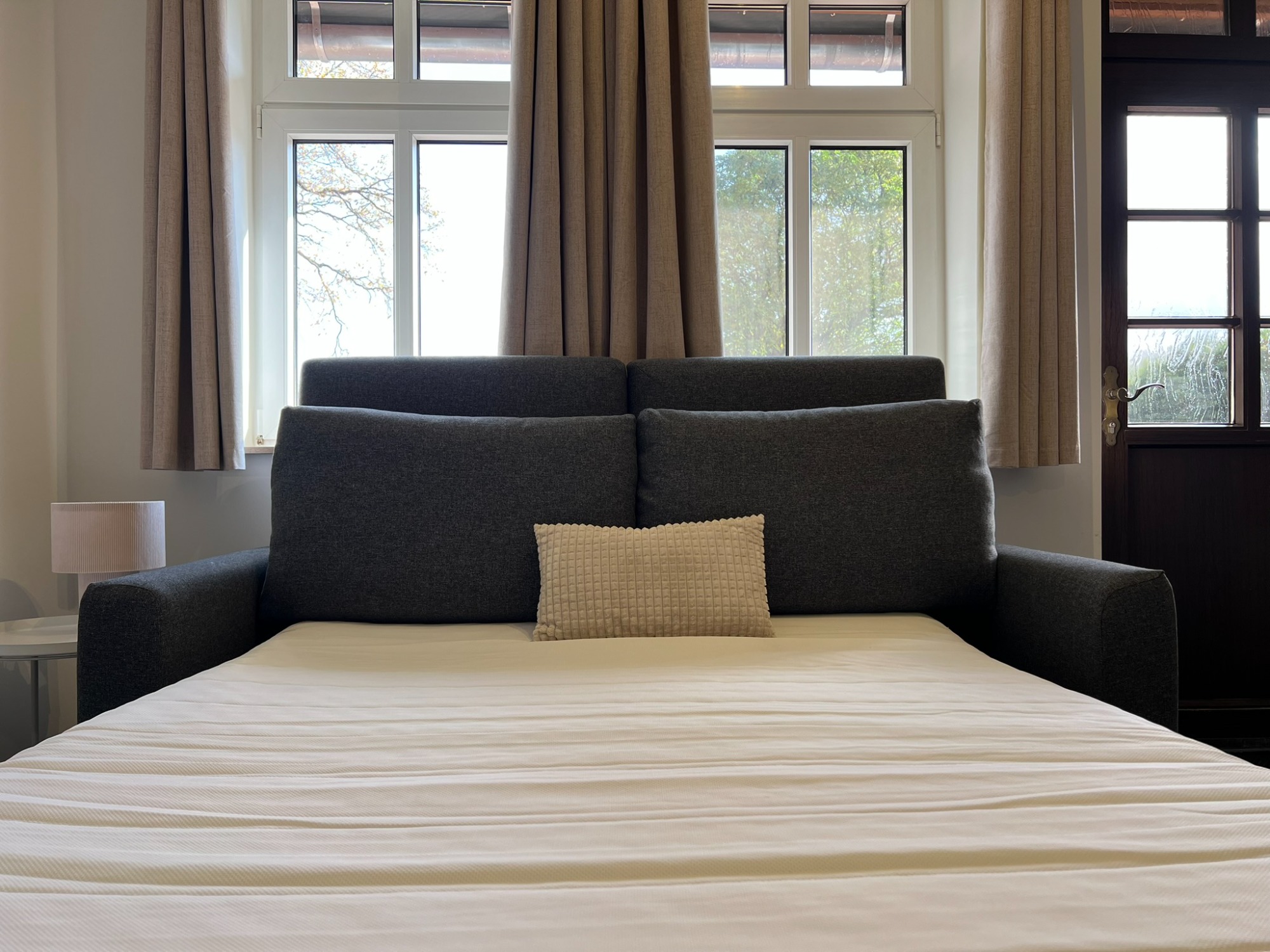 Wohnen: Sofa mit Bettfunktion | Kleiderschrank | Smart-TV | ausziehbarer Esstisch | Gartenblick
