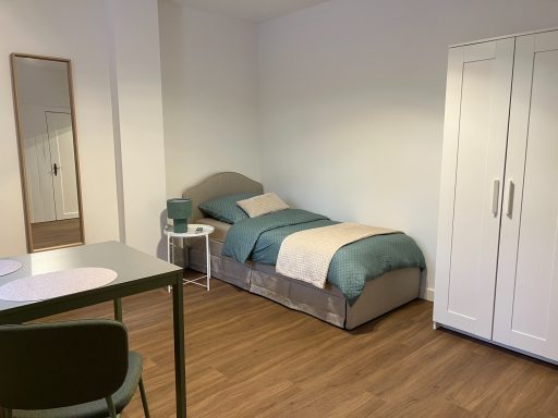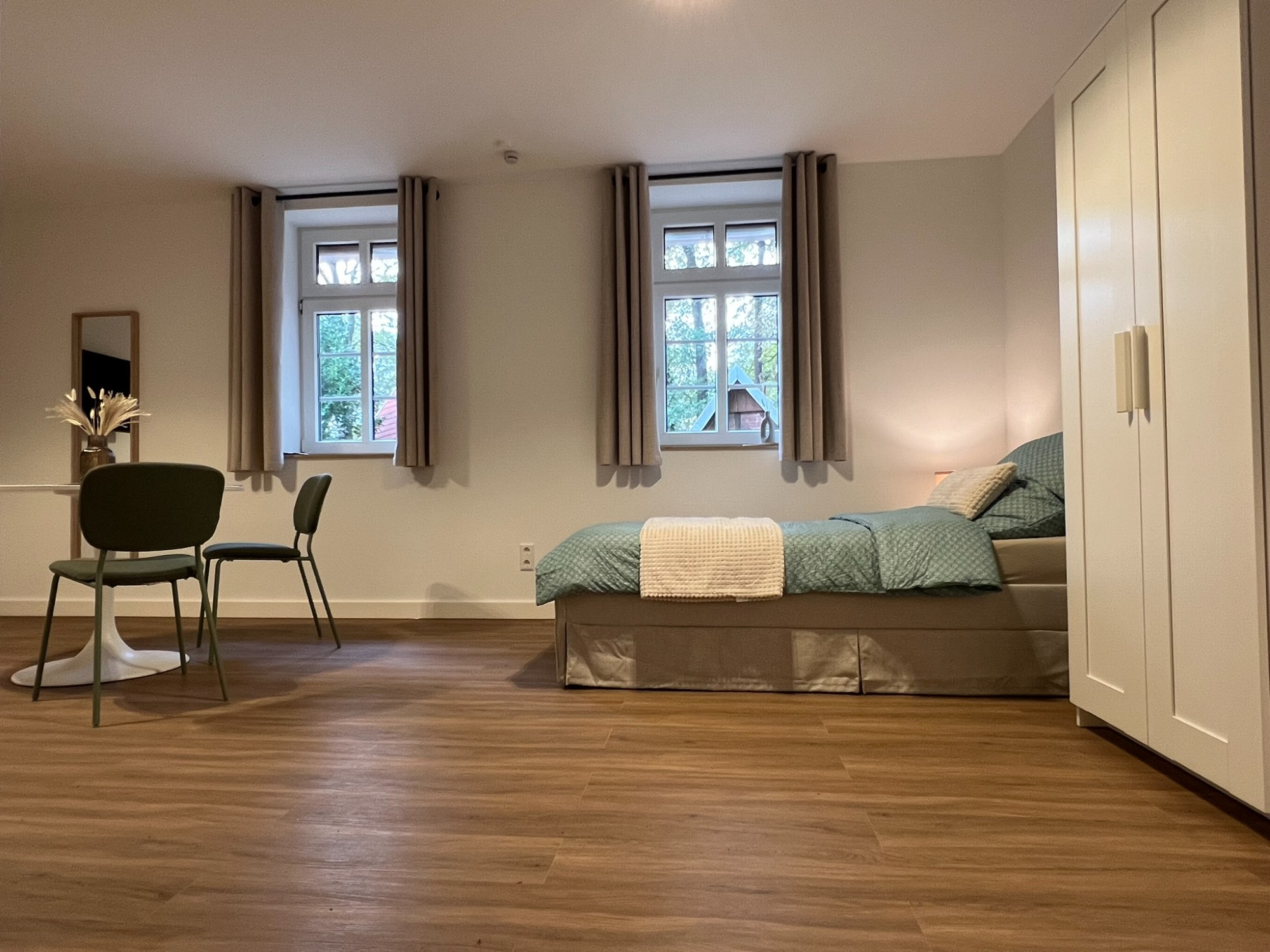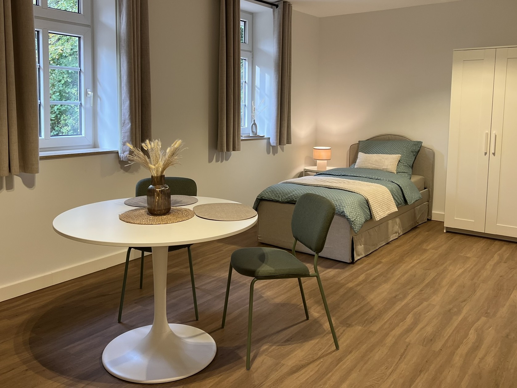 Wohnen: Einzelbett | Kleiderschrank | Smart-TV | runder Esstisch | Gartenblick