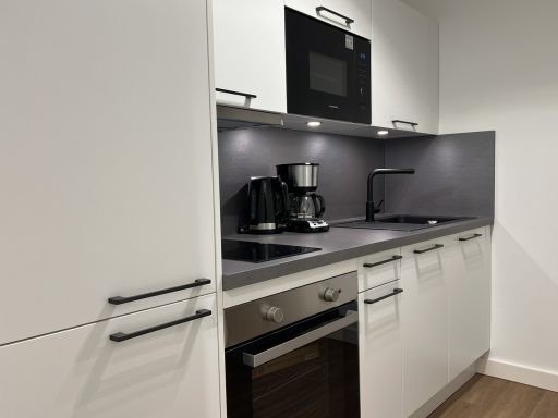 Die Apartments sind möbliert und verbinden Wohnen, Arbeiten und Schlafen auf kompaktem Raum. Jedes Apartment besitzt einen bzw. zwei Smart-TVs, Highspeed-Internet und Fußbodenheizung. Die modernen Küchen sind mit Ceranfeld, Mikrowelle, Backofen, Kühlschrank, Tiefkühlschrank, Geschirrspüler und allen Kochutensilien ausgestattet. Die modernen Bäder verfügen über Dusche, Waschbecken und WC.